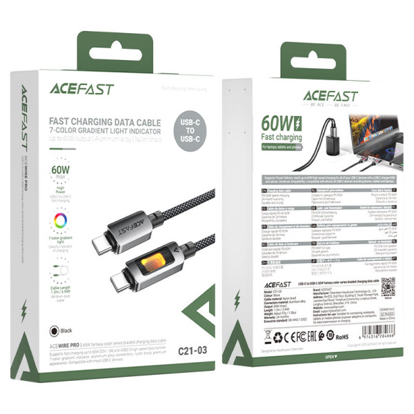 Кабель Acefast C21-03 USB-C to USB-C 60W fantasy color series braided Charging data cable [Black]